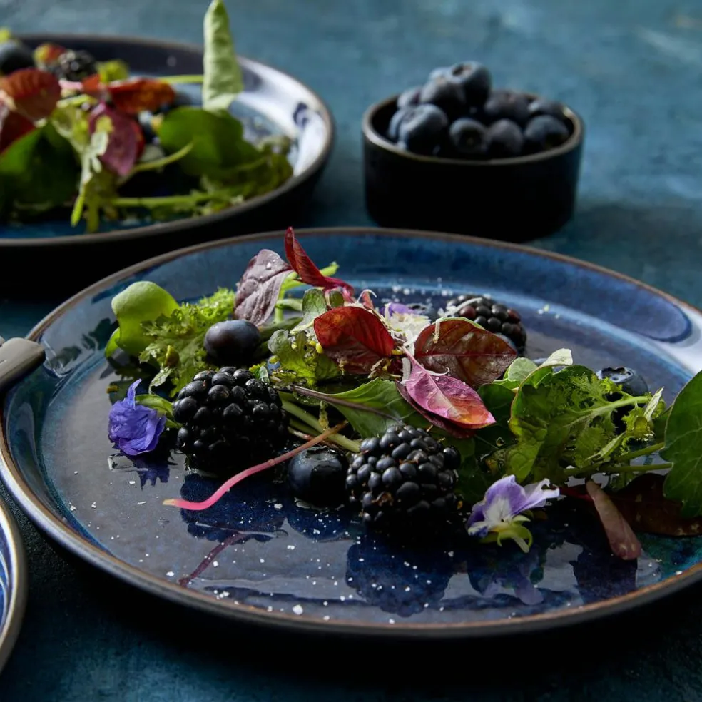 The plate is made of robust stoneware. The combination of the outer, matt glaze and the shiny glazes on the inside give an exciting expression. The plate withstands machine wash, microwave, and oven up to 250 degrees.