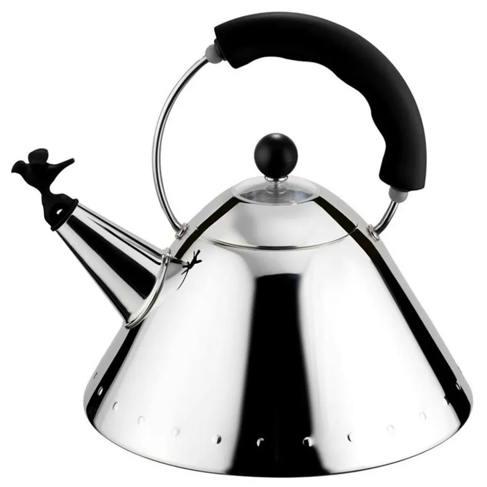 This Alessi kettle is designed by Michael Graves and is one of the most popular Alessi objects in the world. The kettle is made of mirror polished 18/10 stainless steel with a handle and a small bird-shaped whistle in PA. Its magnetic steel bottom also works on induction hobs and when the water starts to boil, the bird sings with a whistling noise, leading to an inevitable smile.