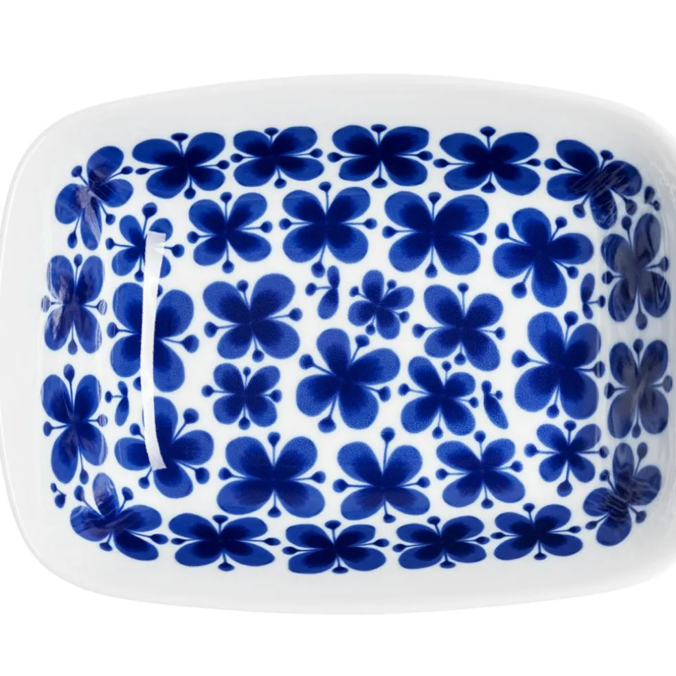 – Iconic, cobalt-blue flower motif.