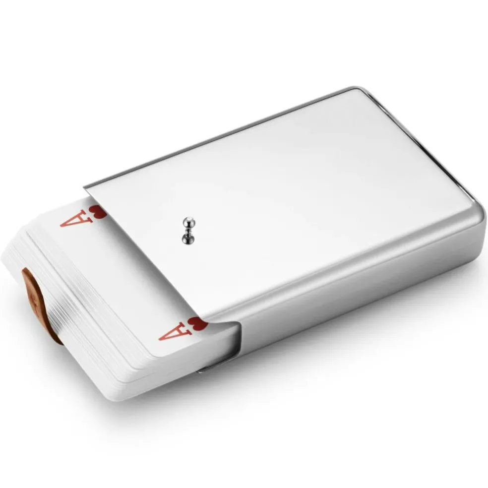 – Card game with a container in mirror-polished stainless steel with a leather fastener.