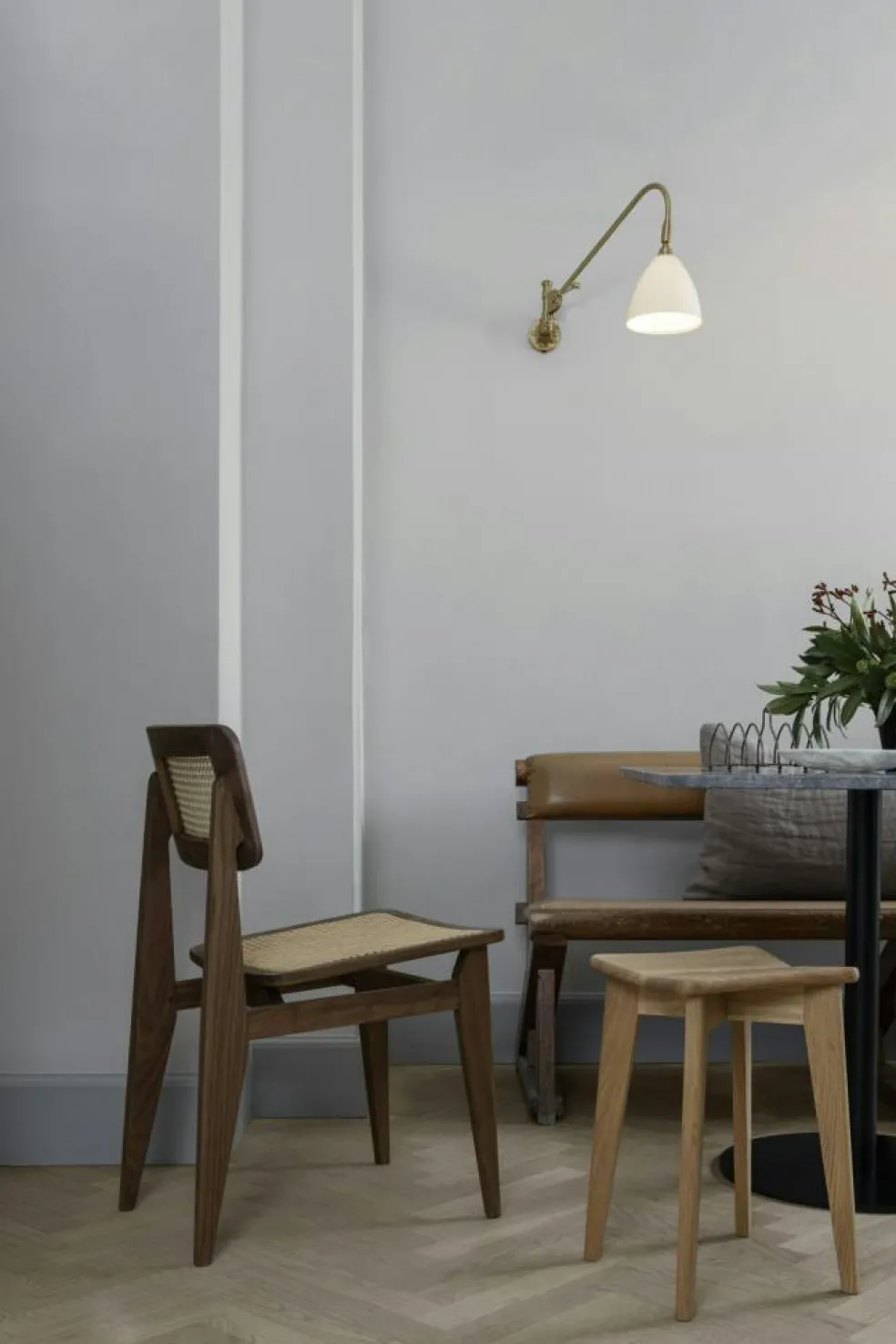 C-Chair from GUBI is designed by Marcel Gascoin in 1947 and is one of his most well-known pieces. The C-Chair was born after Marcel came up with an idea of creating a piece of furniture that was elegant, functional and robust that would fit into the new sizes of homes built at the end of World War II, where there was limited space. The simple chair has a minimalist design language with a lot of attention to the details, where its powerful legs and seat in cane play a major role.