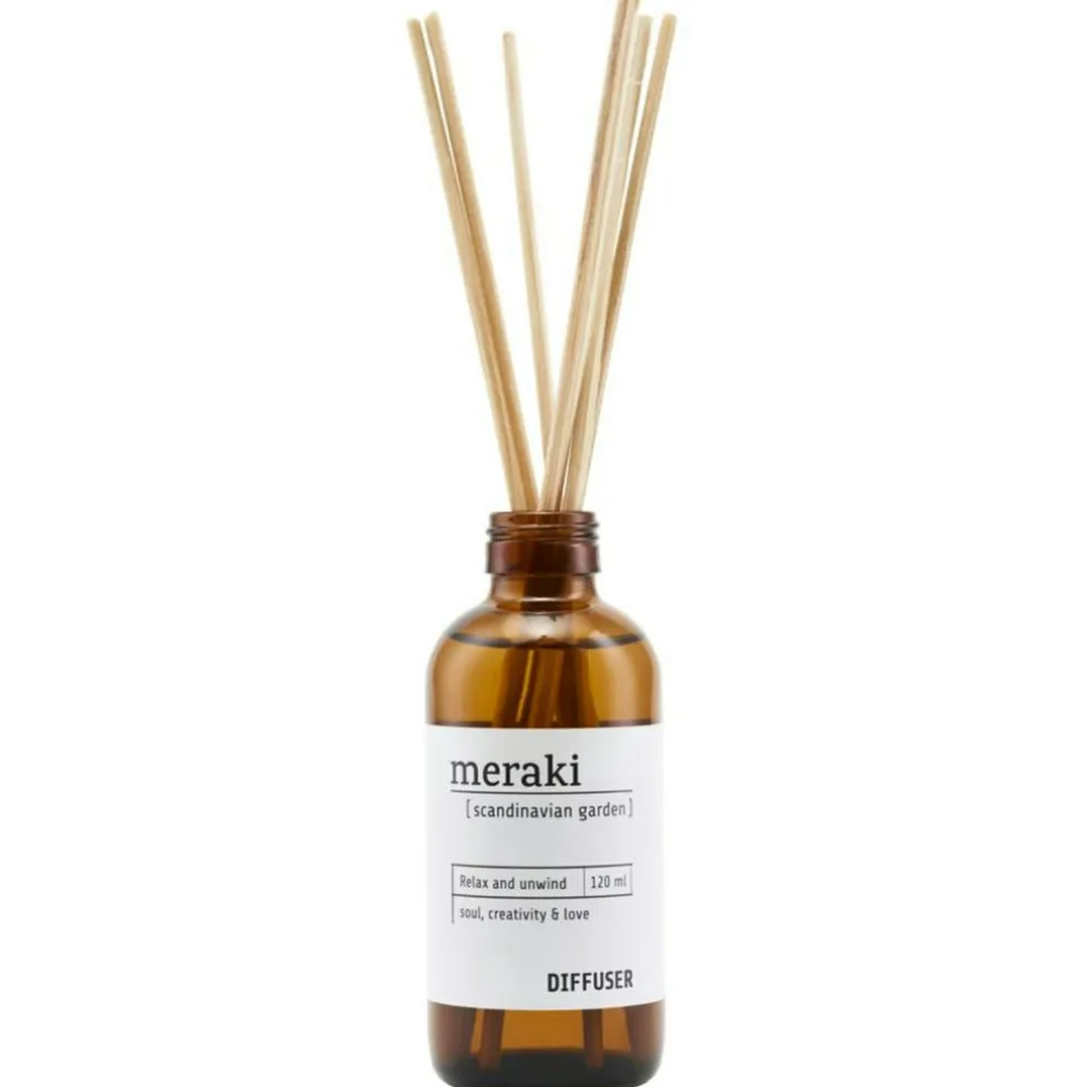 Diffuser from Danish Meraki. Create a wonderful atmosphere with these fragrant smells. The diffuser consists of seven scented sticks that give a gentle and sensual scent. Use them in the bathroom, living room or anywhere else where you want a refreshed smell. Available in three different fragrances; nordic pine, scandinavian garden and sandcastles & sunsets.
