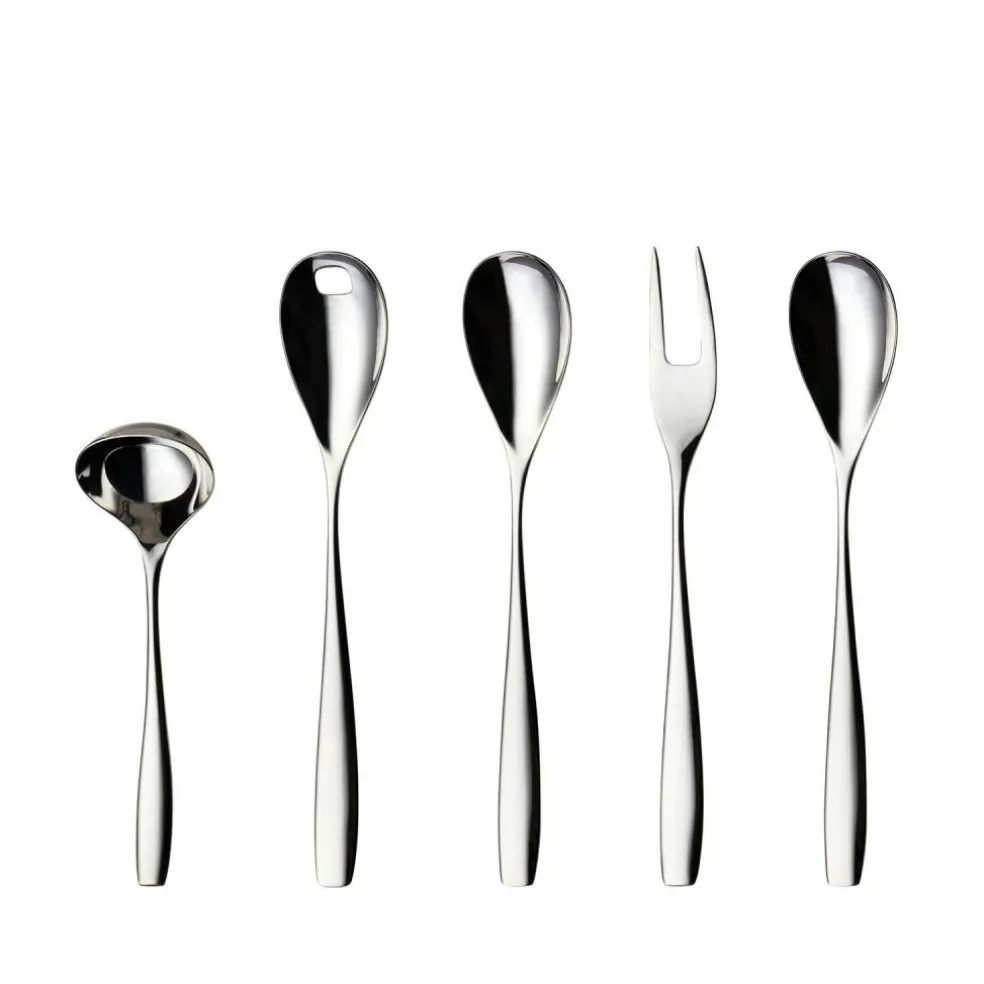 This serving set with five pieces from Hardanger belongs to the series Julie, which is designed after the contours of the hand. With elegant shapes and well-considered functionalities, Julie will be a success on every table. The series is designed by Per Finne.
