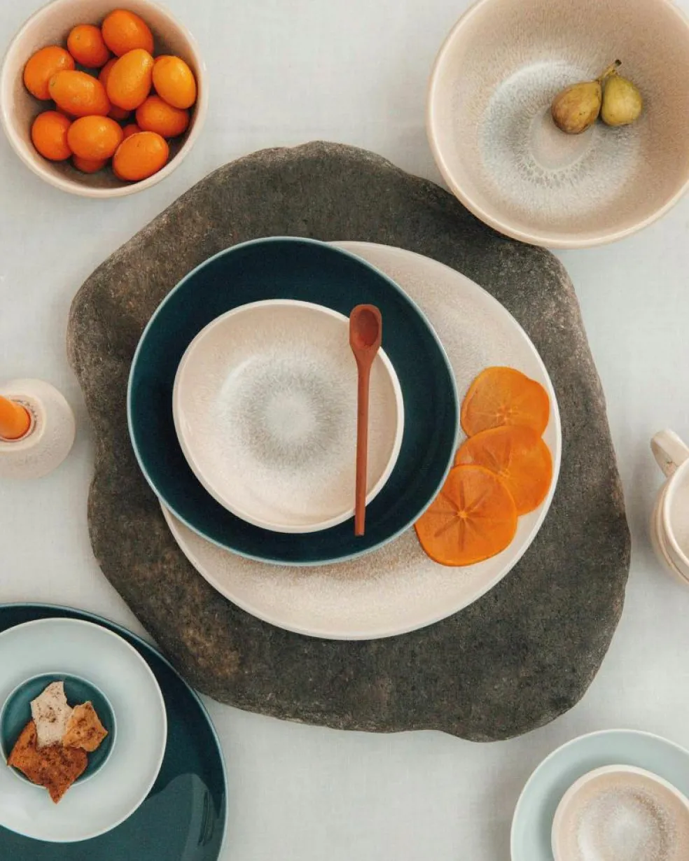 Das Designer-Steingut Junto von Rosenthal stellt mit seiner speziell entwickelten reaktiven Glasur, die jedes Stück Steingut einzigartig macht, einen angemessenen Kontrast zu der Porzellan-Kollektion dar. Eine dünne Glasurschicht verleiht der Kollektion einen dunklen, seidenglänzenden Schimmer. Je nach Form entstehen so einzigartig strukturierte Flecken auf der Keramikoberfläche. Für Mikrowelle und Spülmaschine geeignet. Größe: 16 cm.