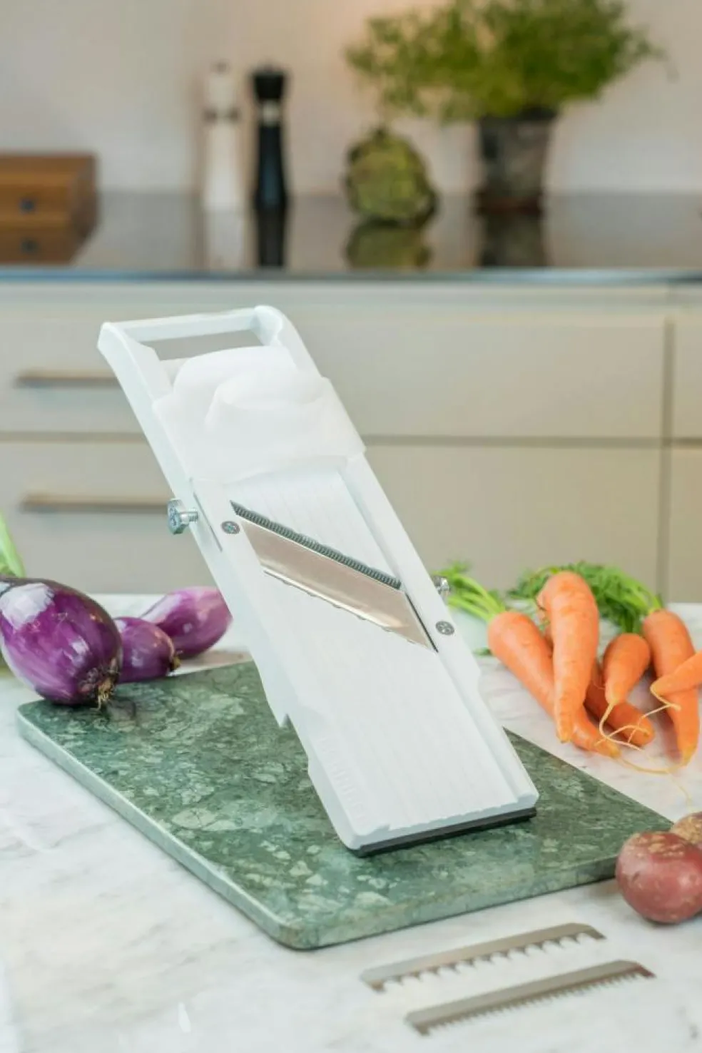 Benriner is known worldwide for its high-quality mandolins made of a handmade steel blade and BPA-free, food safe plastic frame. The mandolin is perfect for cutting thin slices or shredding vegetables and root vegetables. With stepless adjustment of the blade you can easily adjust how thin discs or strips you want.