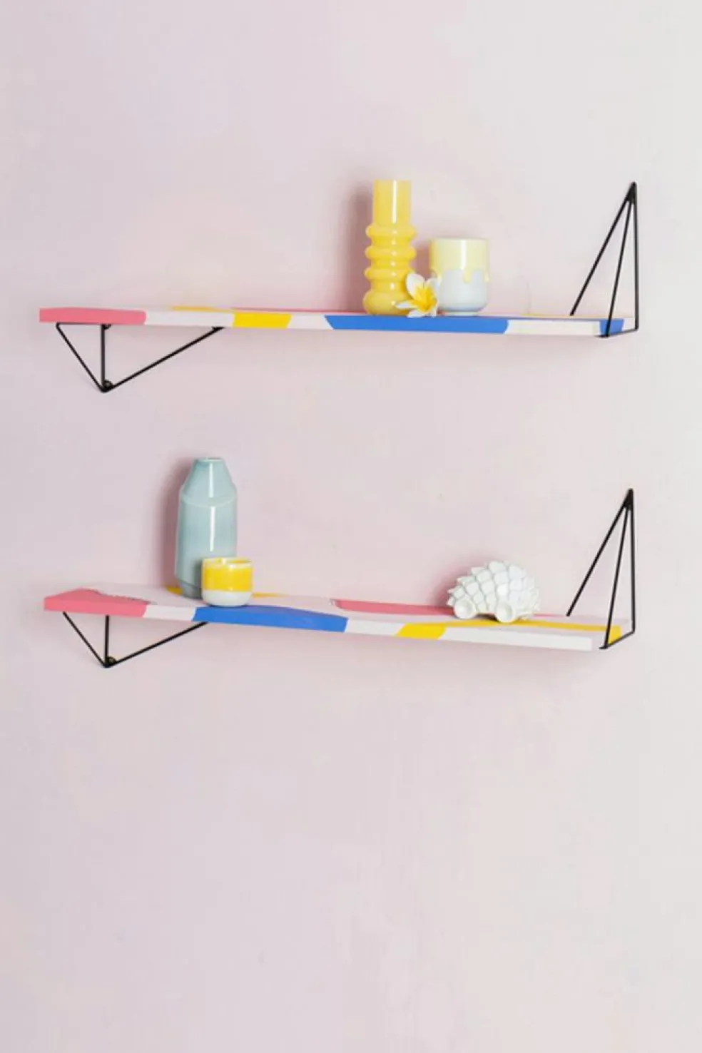 Think freely and place the shelves next to each other and the brackets upside down or vice versa. Paint flowers on the shelves or just plain in one colour. Everything is made from recycled material. The shelves are made of pine and the metal brackets are available in four different colours. For more ideas see PDF.