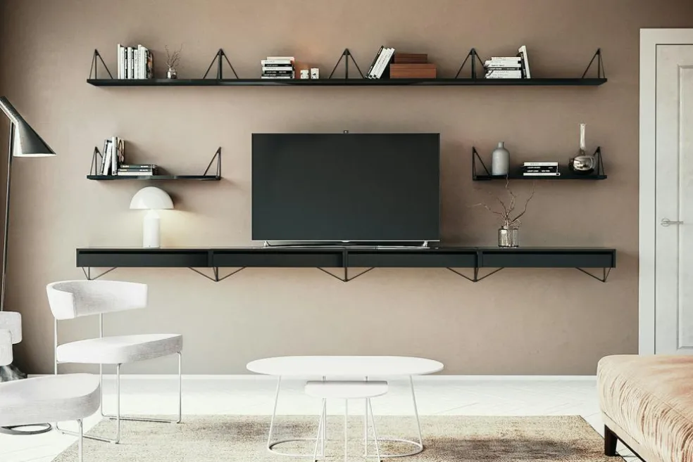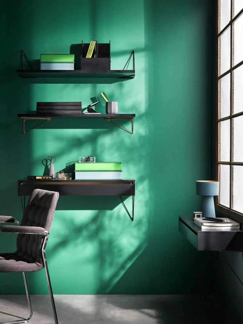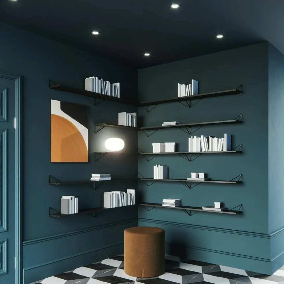 A set ofPythagoras shelf and consoles. Match the different colours and turn the consoles as you want to create a unique Pythagoras wall. The brilliant design on the consoles allows the shelf to be mounted in four different ways.