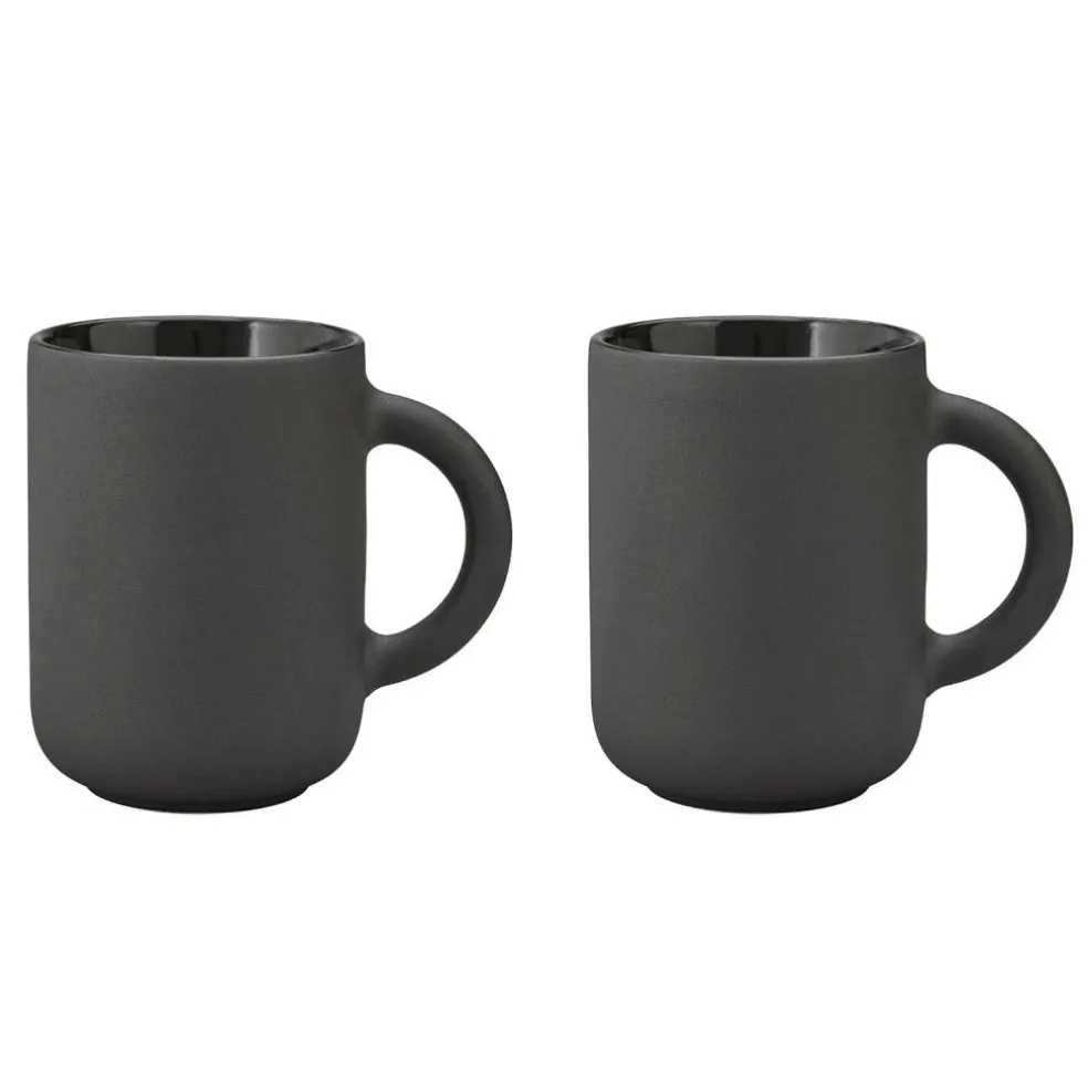 Set with two mugs from Stelton. These mugs has a stylish yet rustic design in matt black stoneware. It is designed by Francis Cayouette and belongs to the Theo series, where Scandinavian design meets Japanese culture.